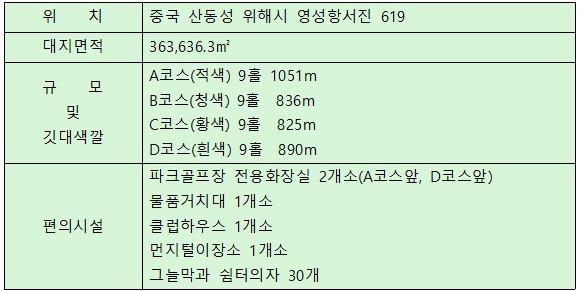 최소한의 장비로 짧고 간단한 코스를 돌며 골프의 묘미를 즐기실수 있는 생활 스포츠 입니다.국제선 왕복 선박권 및 유류할증료+ tax(한국 항만세, 중국 항만건설비)